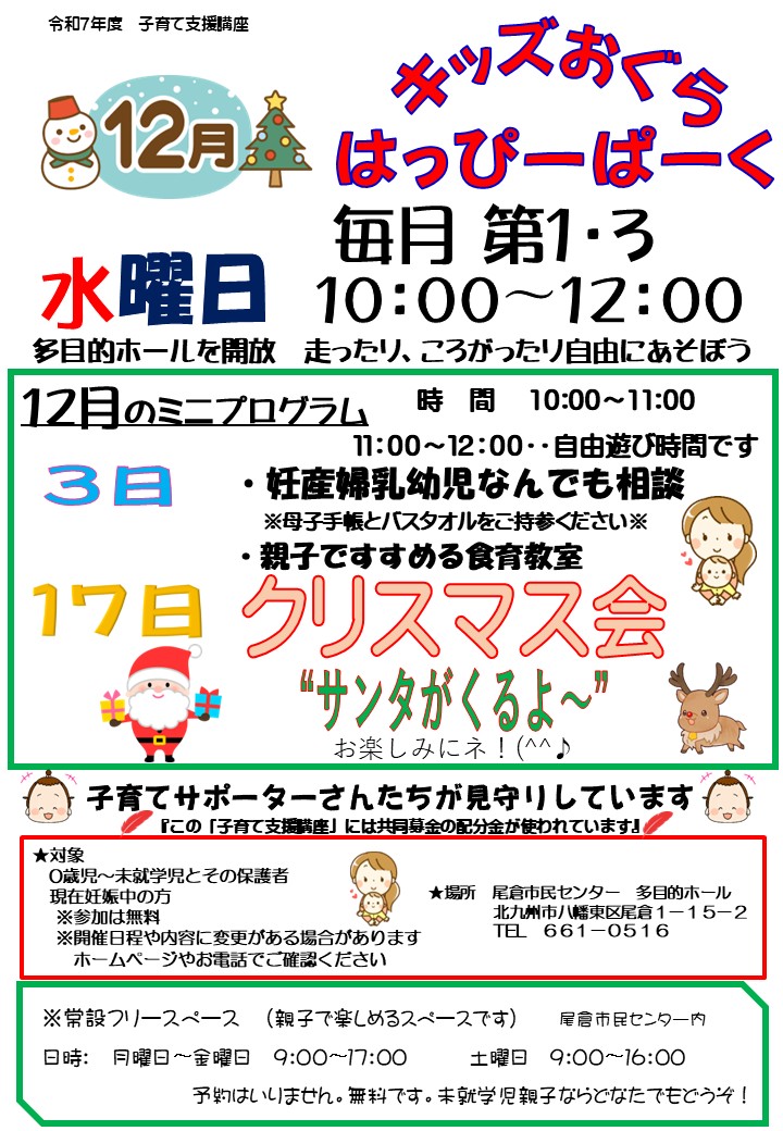 | 9月17日 (水) | ベビーマッサージと 絵本の読み聞かせ | 3月18日 (水) | フリースペース |