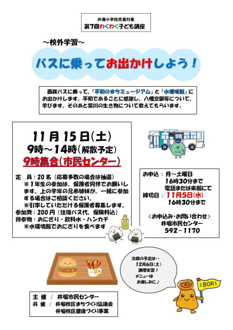 | 11/15(土) | わくわく子ども講座(井堀小学校児童対象) 校外学習 「バスに乗ってお出かけしよう!」 |