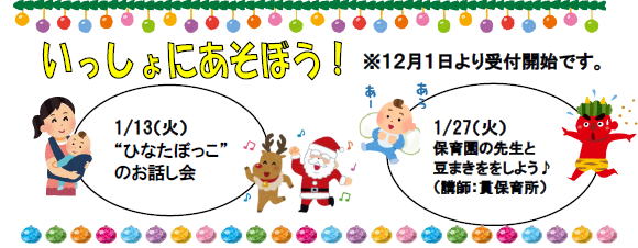 | 参加費 | 無料 母子健康手帳、バスタオルご持参下さい(身体計測の際に使用します) |