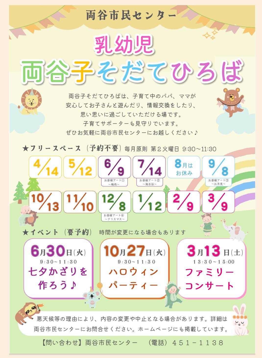 | ◆乳幼児両谷子そだてひろば 子育て中のパパ、ママが気軽に話せる場所を 作りました♪ 子育てサポーターも見守りでいるので 安心してお子さんと遊んだり、情報交換をしたり 思い思いに過ごしていただける場です♪ ぜひお気軽にお越しください! お待ちしています♪ |