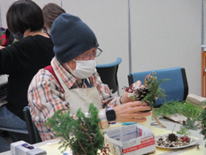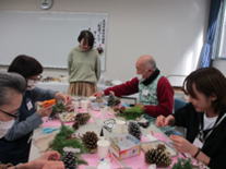 | 12月10日(水)昨年縁あっていただいた大きさ約15センチの松ぼっくり。この大きな松ぼっくりを使って何か作りたい!そこで講師に、クリエーターの武藤香子氏と三村方子氏をお迎えして、クリスマス飾りとお正月飾りを作りました。 | |