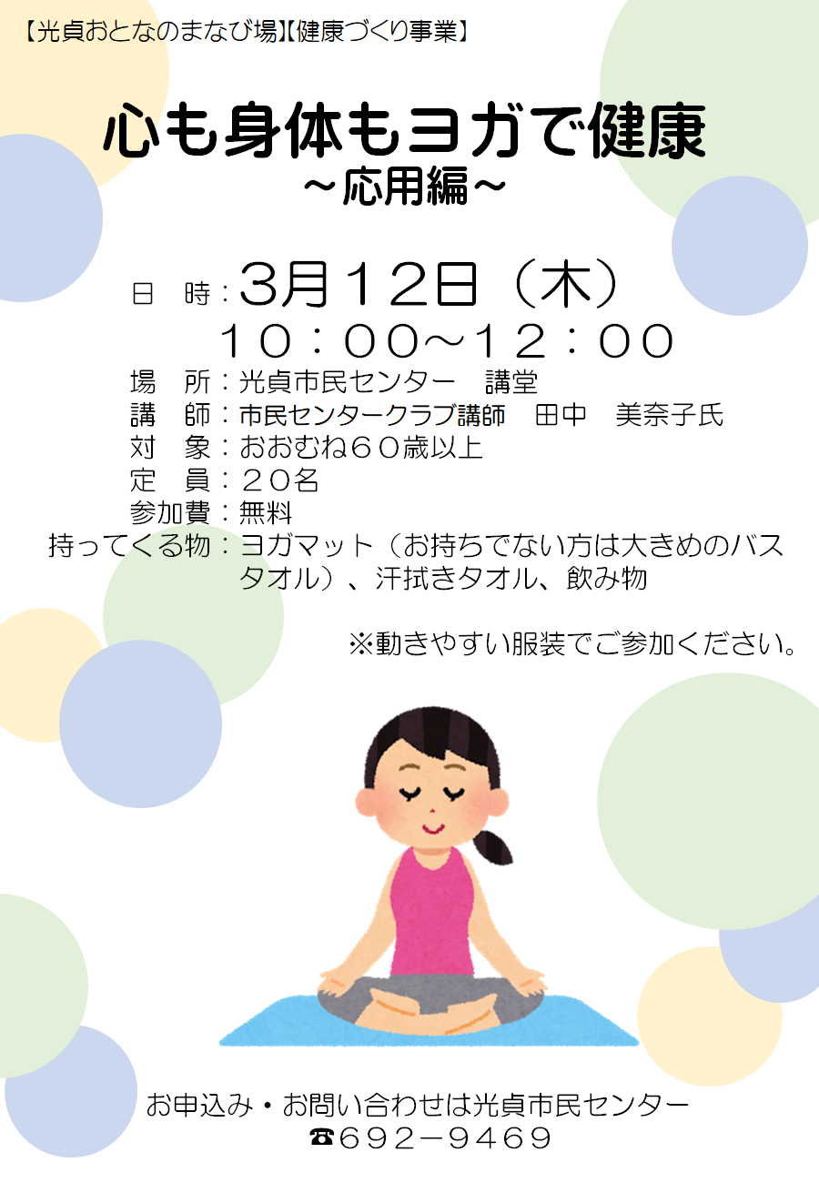 | 【光貞おとなのまなび場】 「心も身体もヨガで健康 ~応用編~」 |