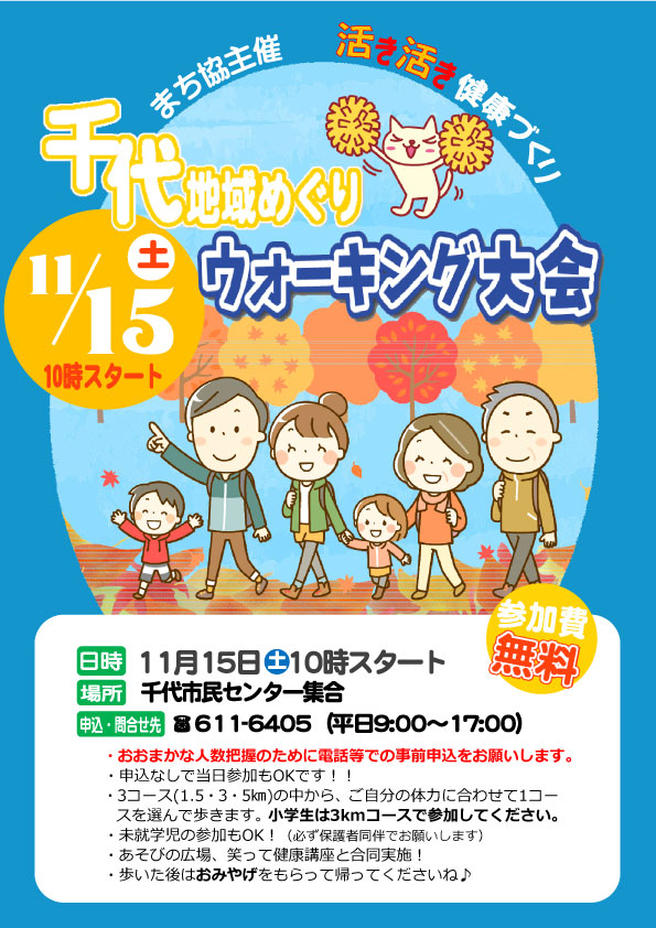【開催日】11月15日(土) 【時間】10時スタート 【集合場所】千代市民センター 【参加費】無料 【申込先】千代市民センター 611-6405