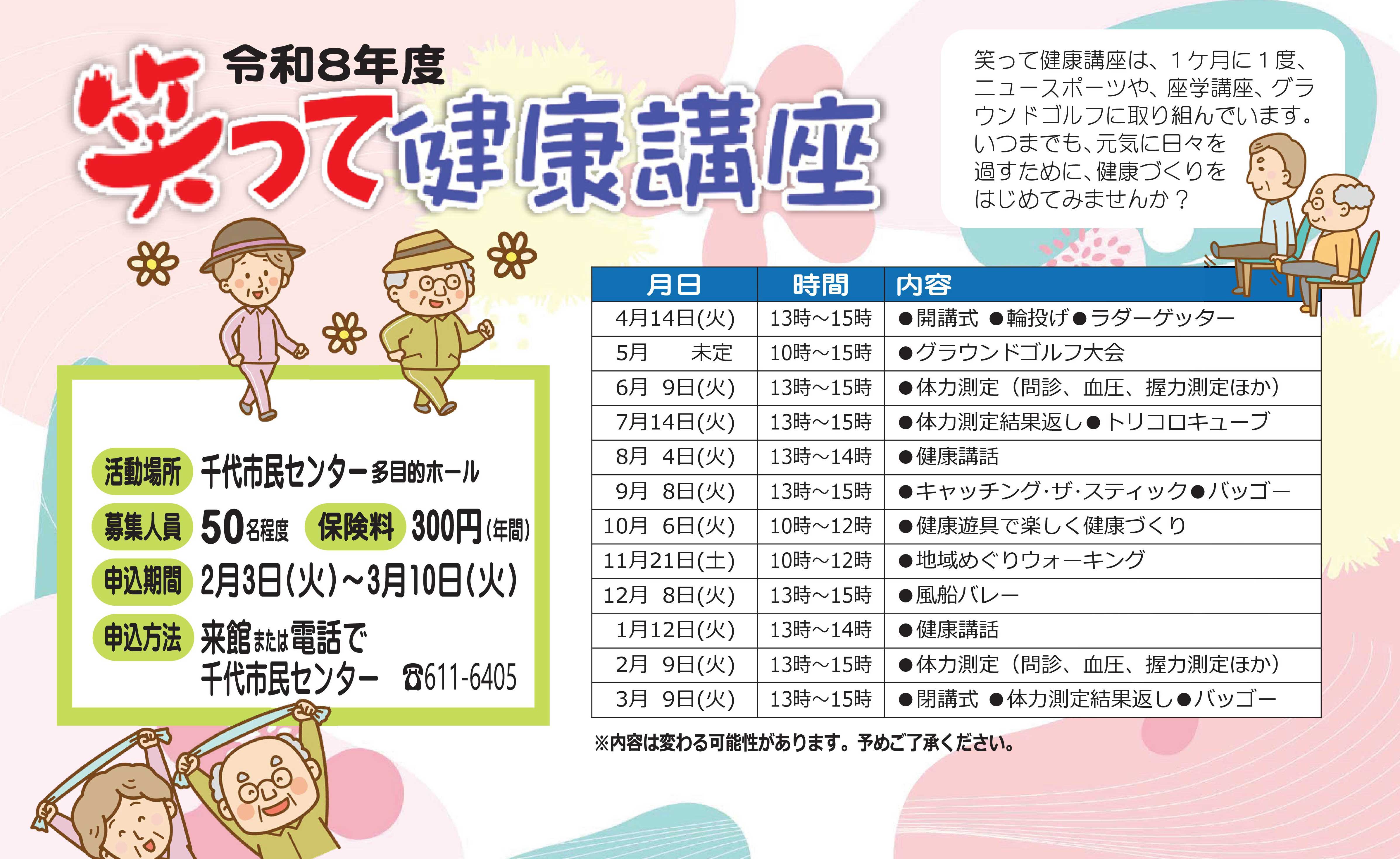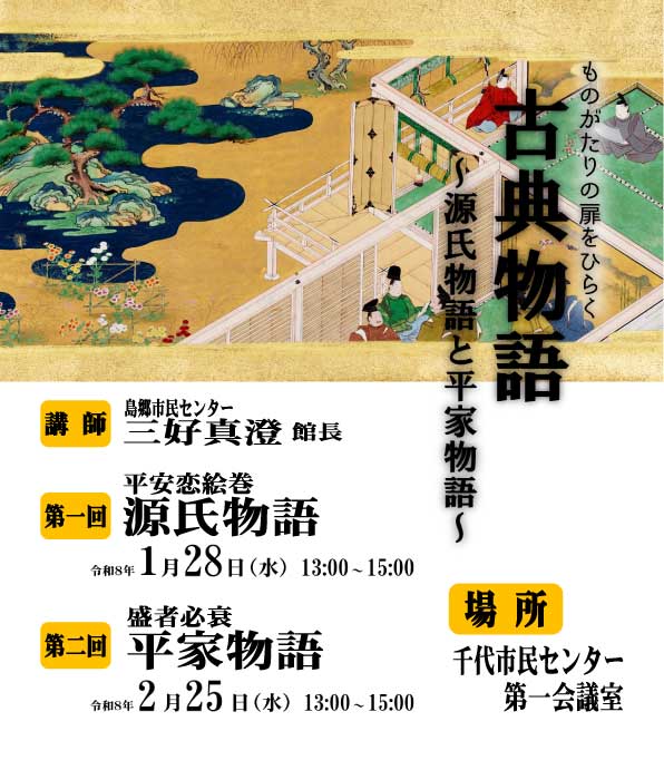 【開催日】第1回 令和8年 1月28日(水) 第2回 令和8年 2月25日(水) 【時 間】13時〜 【開催場所】千代市民センター 第一会議室 【参加費】無料 【申込先】千代市民センター 611-6405 |