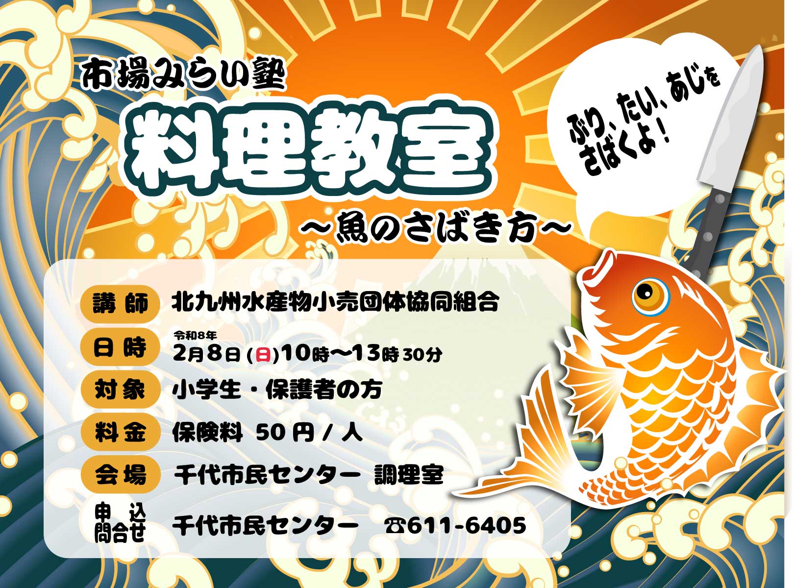 【講師】北九州水産物小売団体協同組合 【開催日】令和8年 3月1日(日) 【時間】10時〜13時30分 【保険料】50円(1人) 【持ってくるもの】エプロン、三角巾 【定員】12名程度 【申込先】千代市民センター 611-6405 |