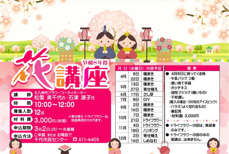 【講 師】 北九州市フラワーコーディネーター 松雪 美千代氏・石津 康子氏 【時 間】10時〜 【開催場所】千代市民センター 【募集人数】12名 【材料費】3,000円 ※寄せ植え・ドライフラワーは別途 【申込先】千代市民センター 611-6405 |