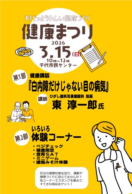 【開催日時】令和8年 3月15日(日)10時〜12時 【開催場所】千代市民センター 【参加費】無料 【第1部】健康講話白内障だけじゃない 目の病気 ひがし眼科耳鼻咽喉科医院 院長 東 淳一郎氏 【第2部】いろいろ体験コーナー ・ベジチェック ・健康測定 ・食育SAT ・減塩みそしる体験 ・ミニゲーム 【申込先】千代市民センター 611-6405 |