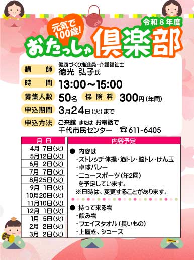 【講 師】 健康づくり推進員・介護福祉士 徳光 弘子氏 【時 間】13時〜 【開催場所】千代市民センター 多目的ホール 【保険料】300円 (年間) 【申込先】千代市民センター 611-6405 |
