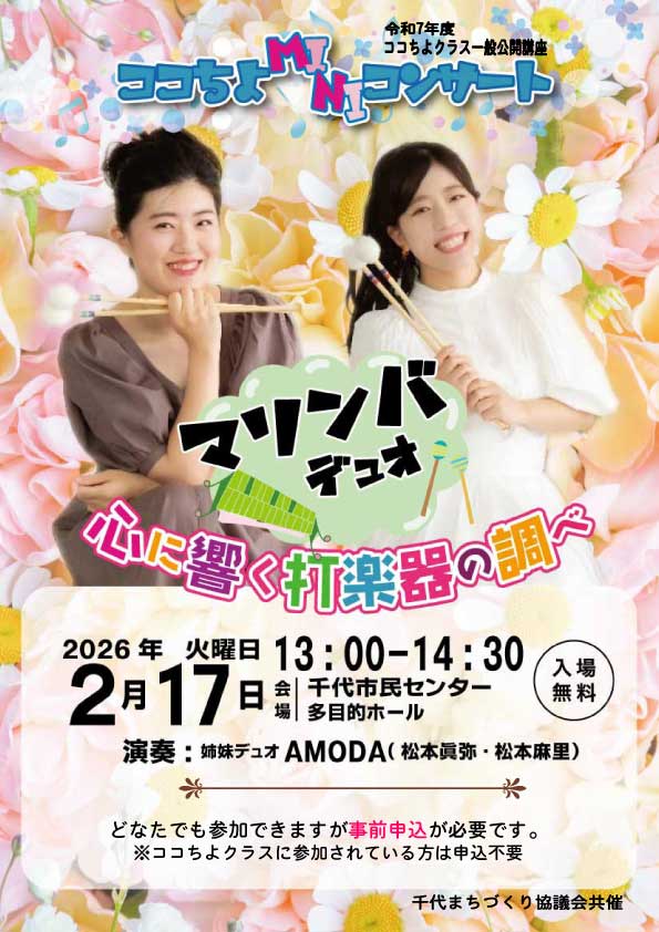 【開催日】令和8年 2月17日(火) 【時 間】13時開演 【開催場所】千代市民センター 多目的ホール 【参加費】無料 【共 催】千代まちづくり協議会 【申込先】千代市民センター 611-6405 |
