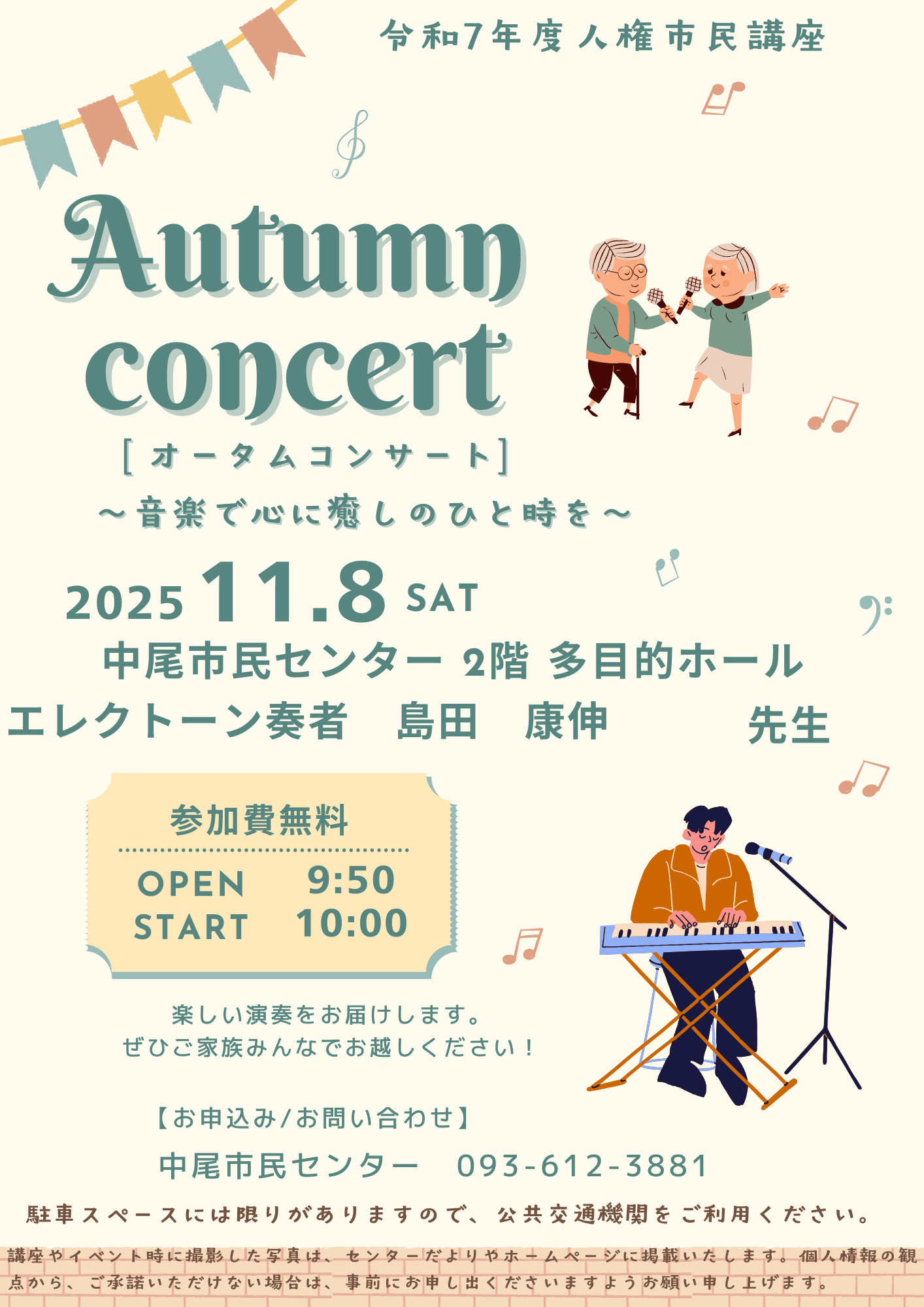 | [人権講座] 絶賛受付中! 11/8(土) 10:00〜12:00 『オータムコンサート』 【講師】エレクトーン奏者 島田 康伸 先生 |