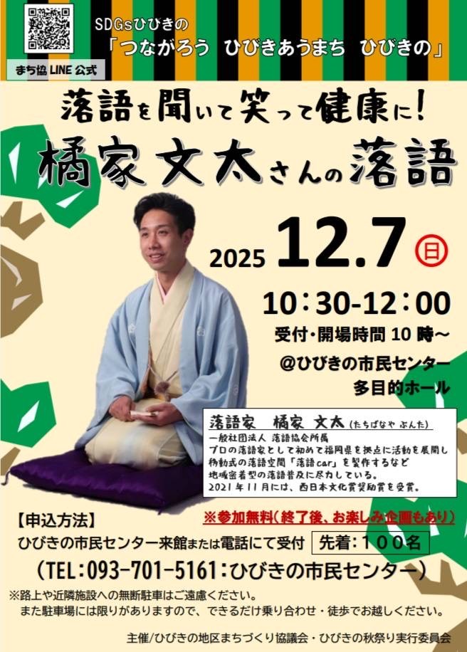 | 中止となったひびきの秋祭りで講演予定だった橘家文太さんの落語を、生で、近くで聞ける落語会です。みなさんお気軽にご参加ください。 | |||